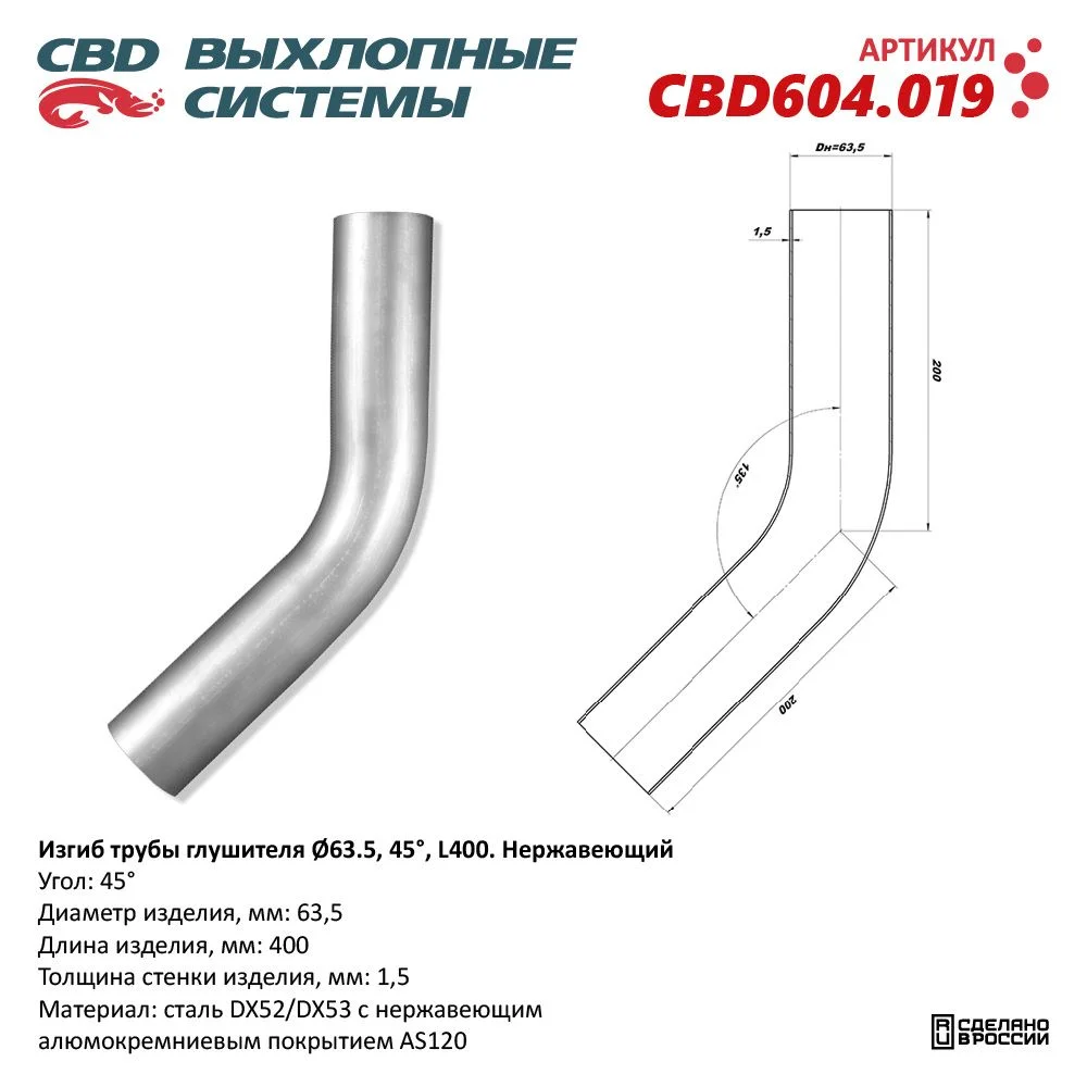 Изгиб трубы глушителя (труба Ø 63,5мм, угол 45°, L400)