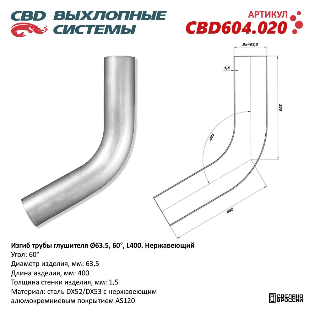 Изгиб трубы глушителя (труба Ø 63,5мм, угол 60°, L400)